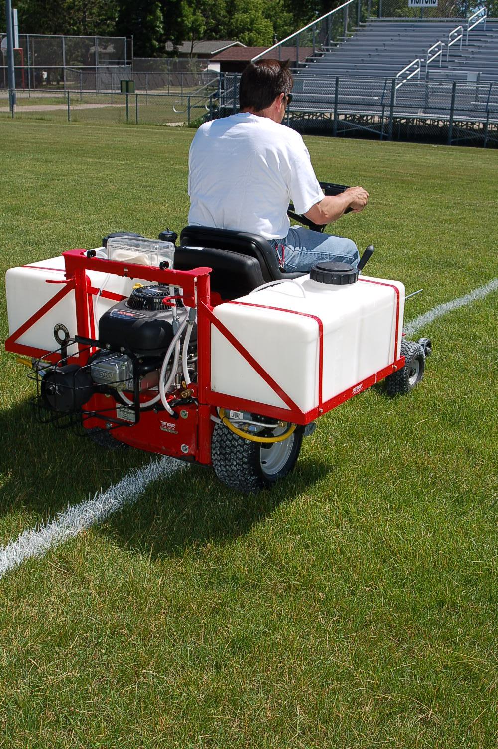 Tru Mark rotates the engine on the chassis so the muffler exhaust exits the rear of the unit versus the side and the charger system has been upgraded to a 16 ampere charging system to support the two 12-volt diaphragm pumps. A specialized muffler guard has been added to ensure a safe barrier. The B&S gas, air, and oil filters are still easily accessible on the chassis with the swing out paint tank brackets.